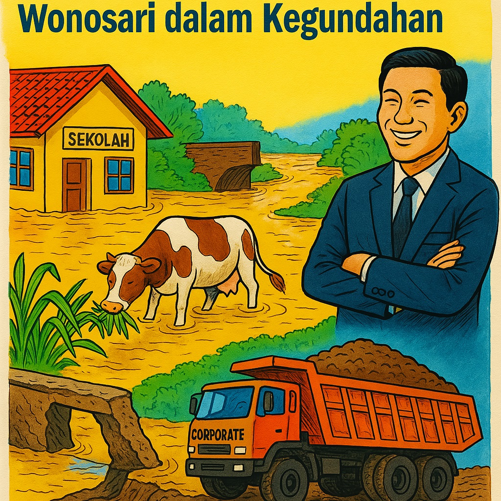 Saat kami terendam, ternak yang dituding bersalah. Ketika jembatan ambruk dan akses jalan terputus, yang menjadi agenda darurat adalah rumput yang termakan ternak. Ironi ini begitu menyakitkan. Seolah nyawa kami tidak sepenting daun. Seolah penderitaan kami hanya latar belakang dari laporan kerugian perusahaan. Kami tinggal di Kecamatan Wonosari, tanah yang kini menjadi saksi bisu dari dua kekuatan: air yang tak terbendung dan kepentingan yang tak tergoyahkan. Satu perusahaan menguasai embung yang tak mampu mengendalikan banjir. Perusahaan lain mengangkut hasil sawit dengan truk bermuatan berlebih hingga merusak jalan desa yang menjadi nadi penghubung antarwarga. Jalan retak, jembatan tumbang, tapi laporan tetap bersih dan investasi tetap berjalan.